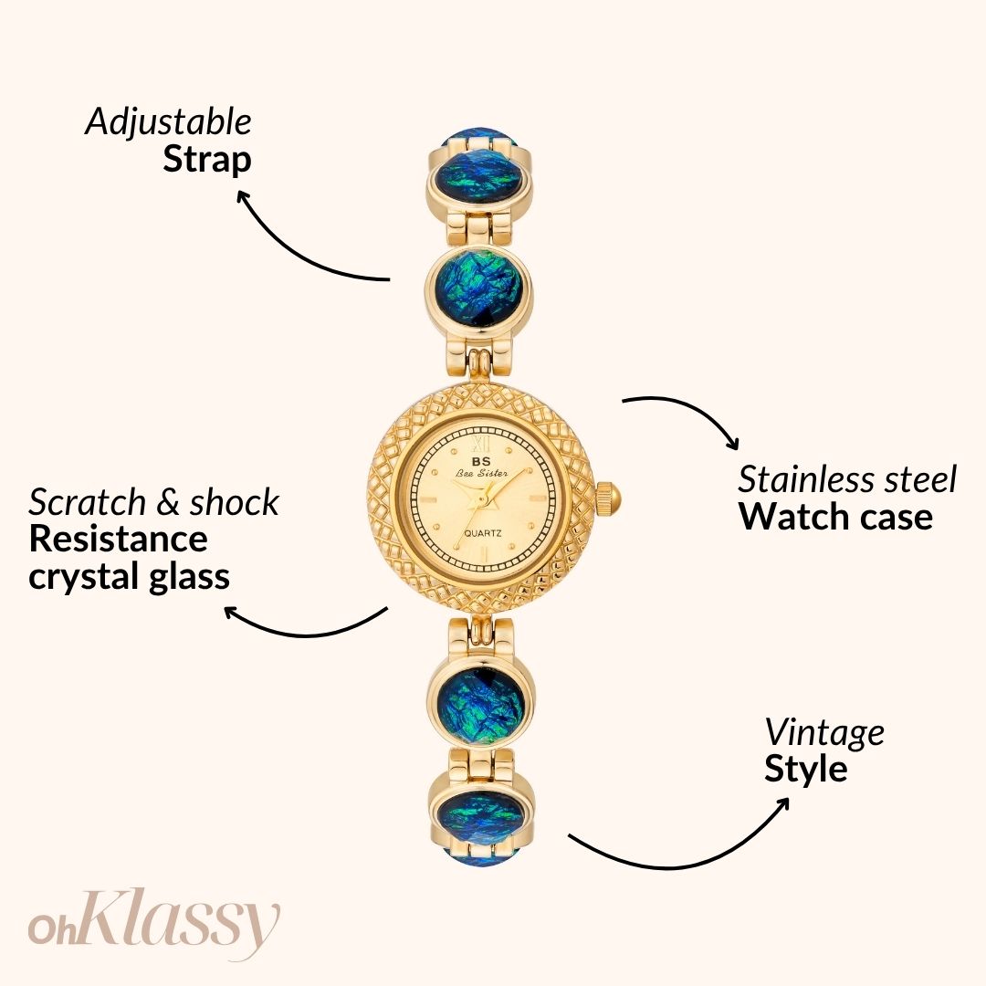 - Bracelet: Gold-plated alloy, adjustable